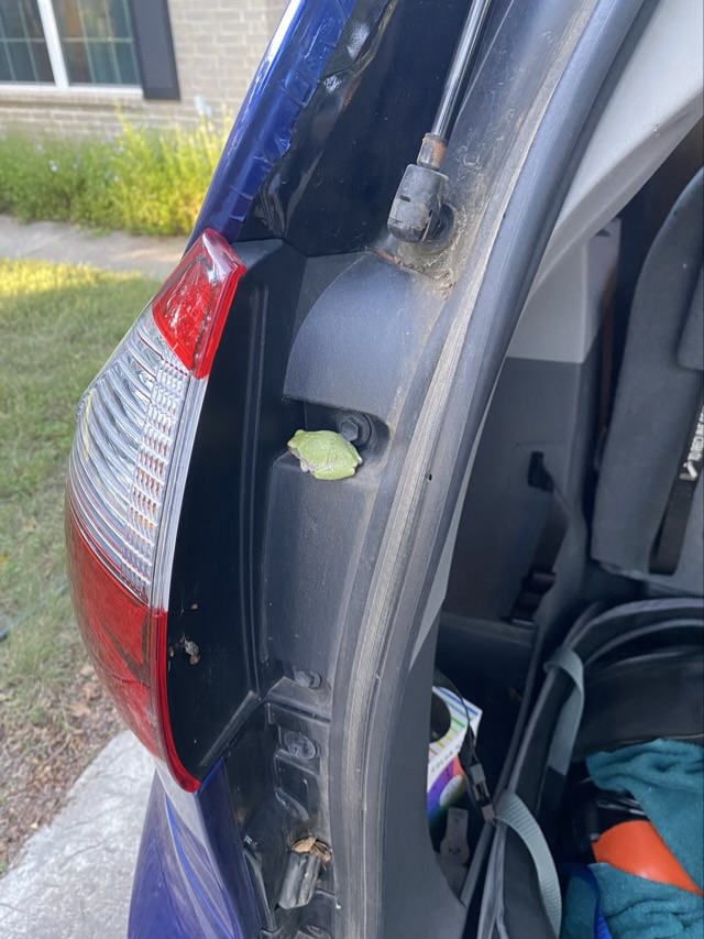 I was certainly surprised to find the frog in the door jam when I opened the rear door. He has been gently removed and returned to a tree.