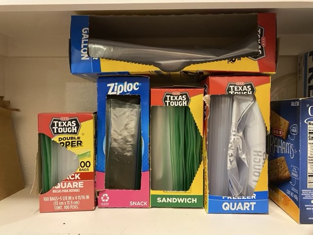 There are many times that I’m late to the proverbial party. I’ve been keeping my boxes of sealable plastic bags flat on a shelf in my pantry. I struggled with which size I was grabbing, and usually had to move the gallon bag box off to select something below it. I realized recently that the labeling on the boxes is designed to be seen at the top of the box. This works great if the boxes are in a drawer, or shockingly, standing on end on a shelf.