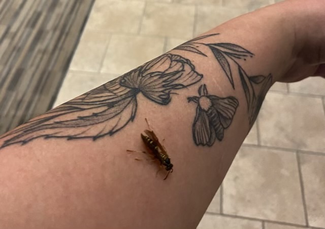 Photo description: wasp on my arm near the silk moth my black and white floral tattoo celebrating fiber sources