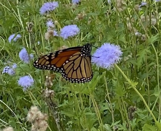 The Monarchs are migrating through Texas. Our Gregg’s mist flower in the front flower bed usually just has Queen butterflies, which look similar to Monarch butterflies. I’ve been spotting more actual Monarchs landing on the purple flower puffs in recent days.