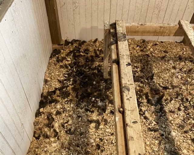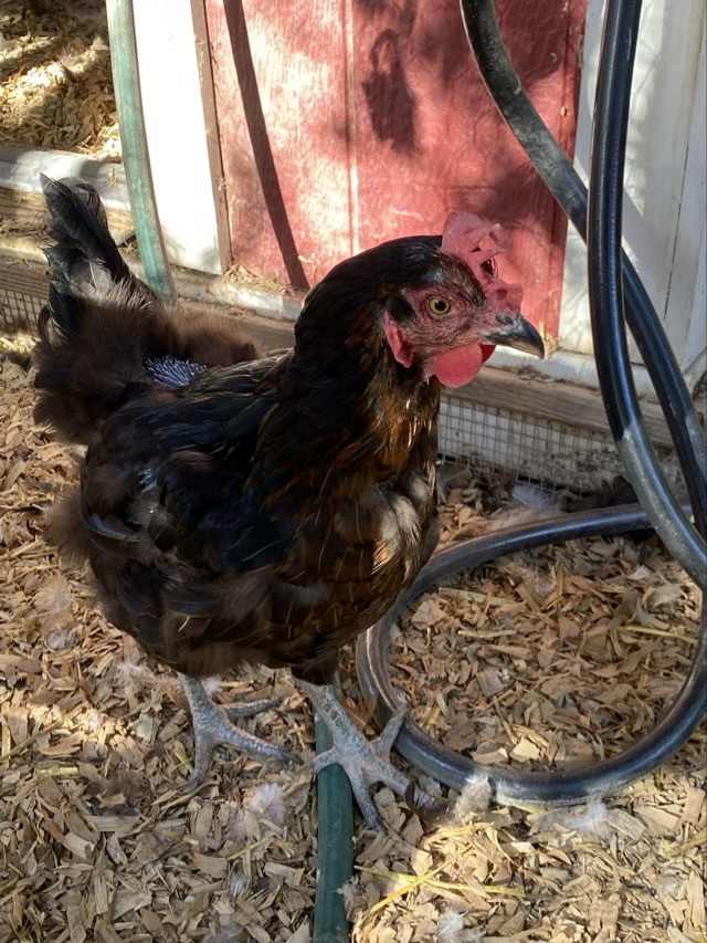 Wing Ding the Black Star hen doesn’t mess around with her molt. When I took a peek at the coop through the web cam, I thought a predator had broken into the coop and taken out a chicken. I went out and all four hens were fine, Wing Ding was just molting.