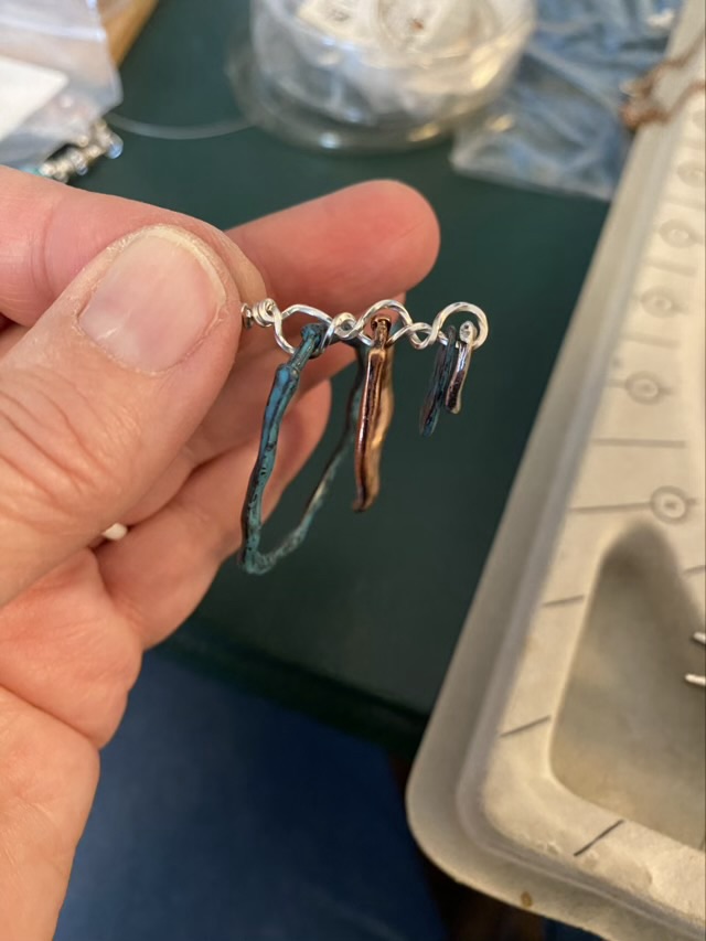 Here is another requested repair from my mother-in-law. This is a pretty nested tear drop design made from several colored loops. Here, the component holding all the loops broke in half.
