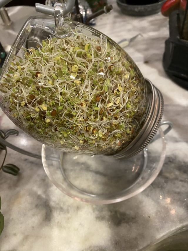 This is my Dad’s favorite seed jar, and my folks sent me one. I absolutely concur with my Dad’s assessment; this is neat. It is basically a jar with a built in hook and a stand so the jar can hang upside down to drain. The lid is metal mesh to allow the water through. A few times a day, you rinse the seeds and hang it back up to drain. I have my set on the back of the sink, so it is easy to remember. When the sprouts fill the jar, I put them in the fridge and start a new round. It has been a very good way to encourage me to eat salads.