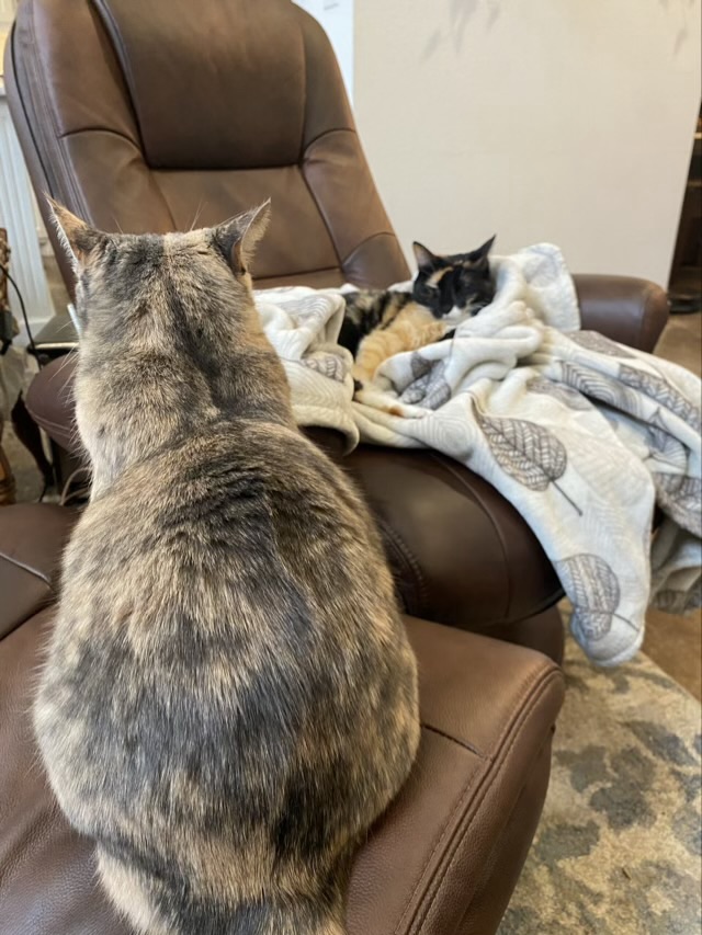 This was an interesting game of cat chess. Izzy the calico was cuddled in the fuzzy blanket on my chair, and Sophie the dilute calico jumped up on the footstool and stared at her. Izzy woke up when I took the picture, saw Sophie sitting higher than she was, so moved up to the top of the chair in a checkmate move.