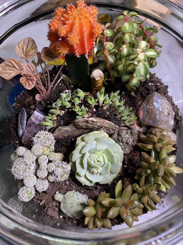 We had an old tea jar that lost its lid, so I made it into a terrarium. Since the top was open I opted for succulents, which like the dryer environment.