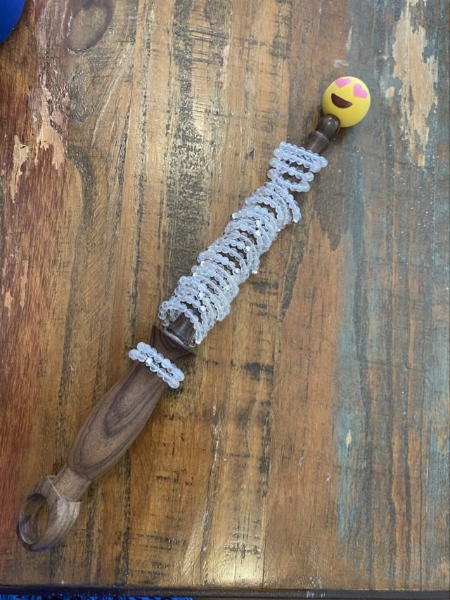 My turned rosewood distaff made by Enid Ashcroft is a beautiful piece of work. I appreciate that the top end is just the right size for a pencil topper, and not only does it function well for its intended purpose of holding fiber for spinning, it can also function as a ring holder. Pictured below it is holding many sizes of quartz bead rings.