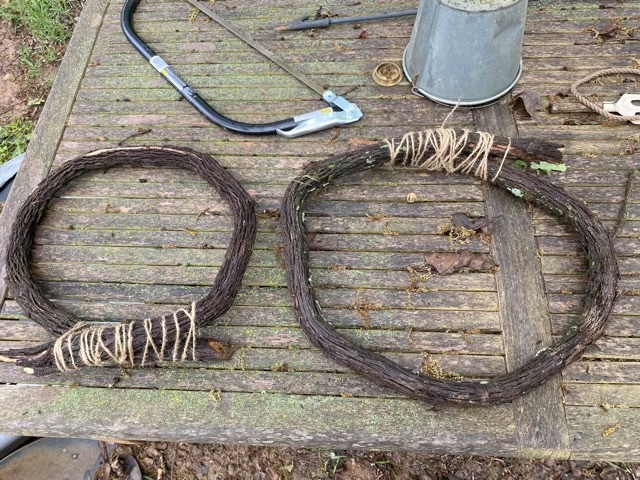When we cut off the ends of the grape vine for our hand railing, my eldest and I curved the ends into a circle and lashed them. It definitely took two pairs of hands, but they bent without breaking. The idea is that when they dry, I will trim them and make loops for either wreaths or other craft projects.