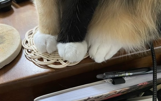 Photo description: three visible white cat paws of a calico on a woven coaster made of round reed