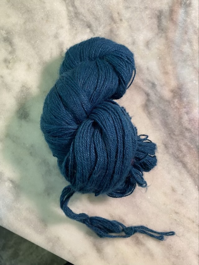 Photo description: gray-blue hank of yarn opened up from the storage twist with familiar strands of yarn tying the loops of the skein together at the ends