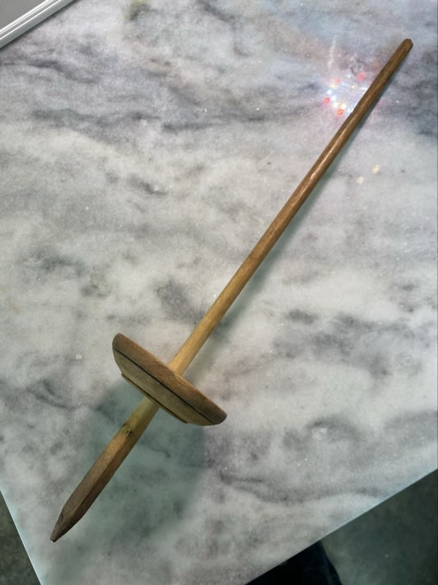 Photo description: working spindle with bottom whorl. The shaft is square below the whorl but rounded and long above the shaft. The shaft shines where it has been rubbed smooth by fingers turning the spindle.
