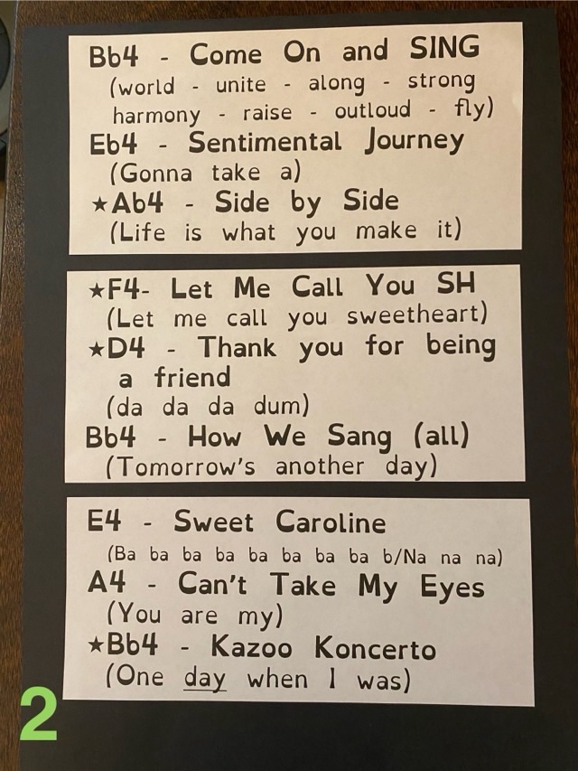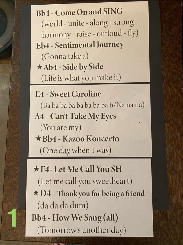 My chorus uses a cheat sheet for performances: a piece of black poster board folded over the director’s stand with the songs we are going to sing, the key pitch, and helpful reminder words. I ran an interesting experiment with fonts, making the same set up twice, one with a standard serif font and one with OpenDyslexic font. I numbered photos and put a poll out on our members only site.