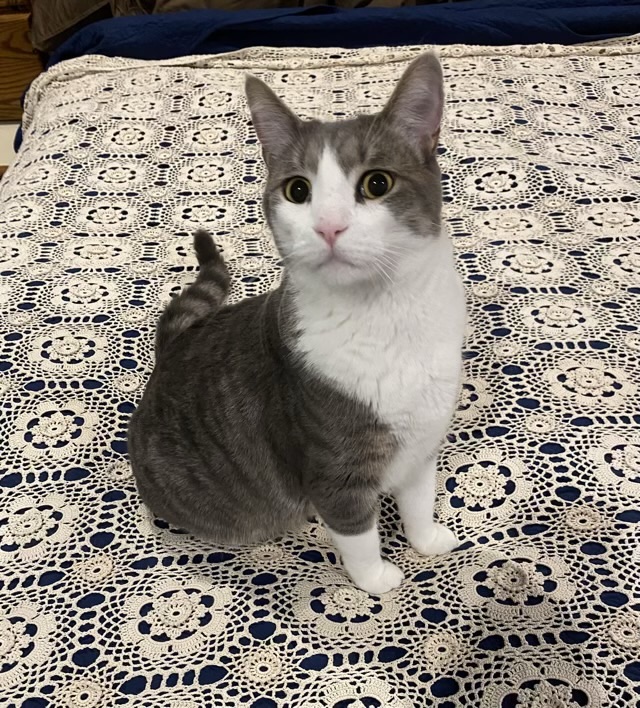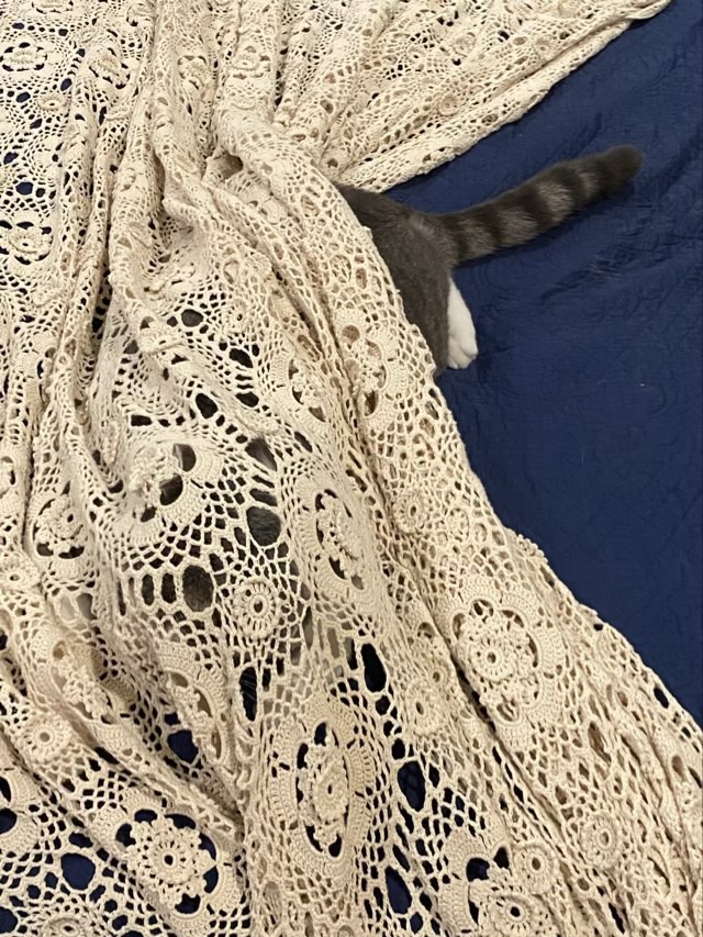 Photo description: 17 pound gray tabby cat sitting on a crocheted lace coverlet, looking like he’a about to start somethingPhoto description: gray tabby cat under a crocheted lace blanket with his tail and back paw sticking out