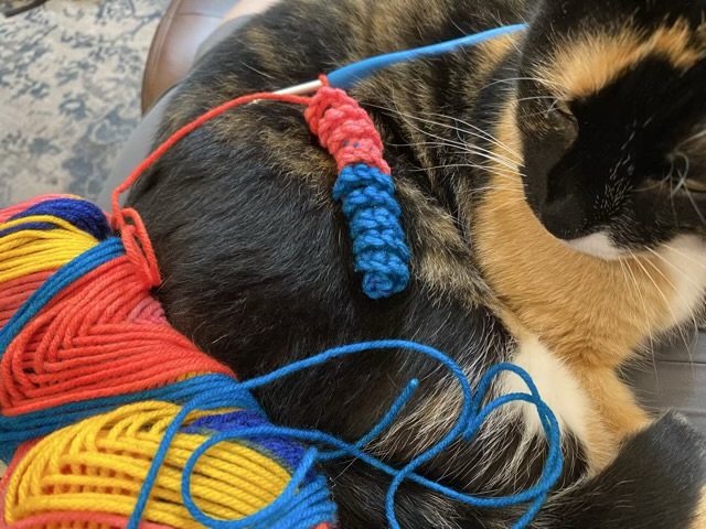 Photo description: red and blue crocheted worm in progress that used yarn from both ends of the skein, calico cat as backdrop