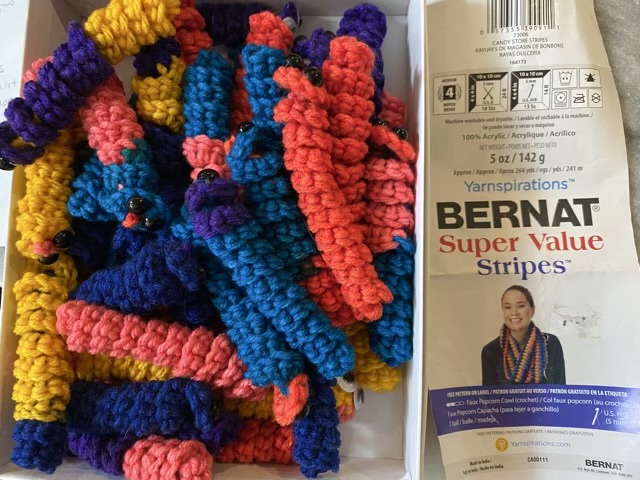 Photo description: crocheted worms of varied colors on the left and the label for the yarn on the right: Bernat Super Value Stripes