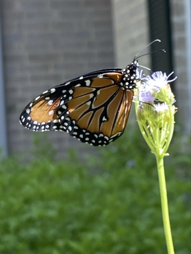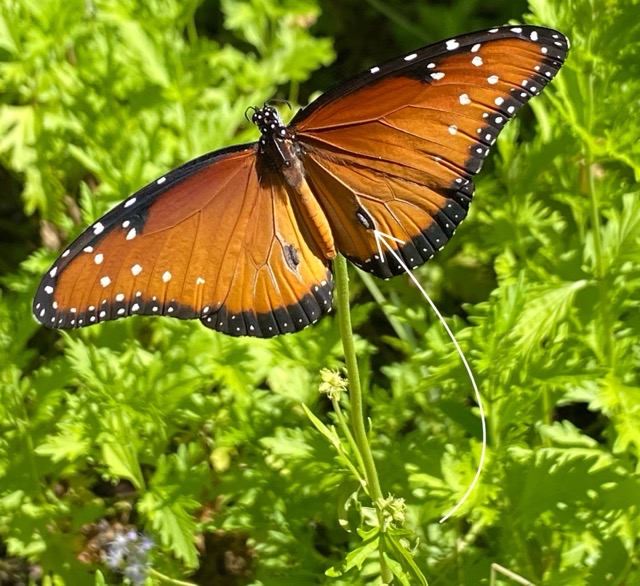 The Queen butterfly (Danaus gilippus) is a common butterfly in North Texas, and is the most frequently spotted in our Gregg’s Mist flower patch.