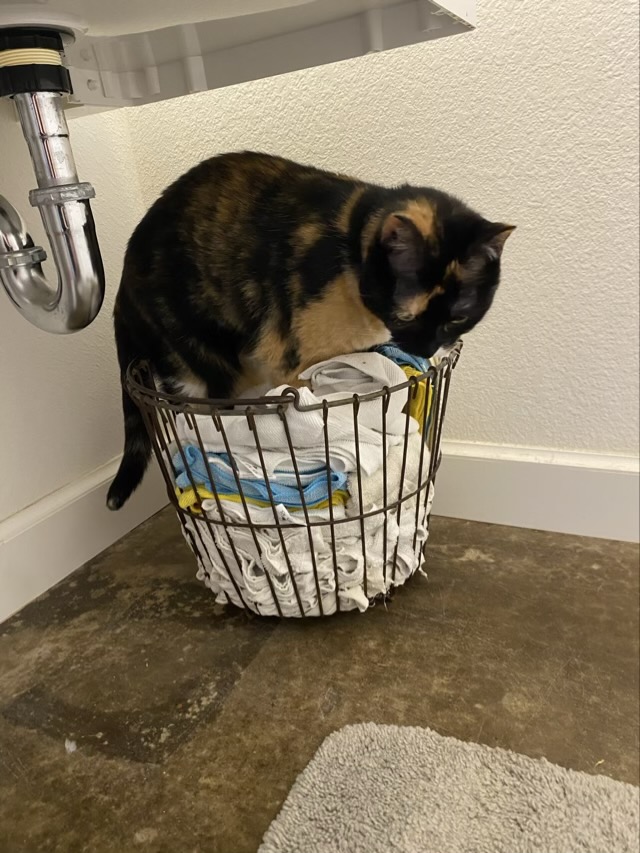 I recently rearranged some baskets in the house. I had a large square basket that used to live under the utility sink full of rags. I had a stack of dog blankets and towels that the basket was more suited for, so I put the rags in an old egg basket. Izzy the cat is miffed that I messed up one of her (many) nap spots. She tried to lay in the new rag basket, but did not care for it.