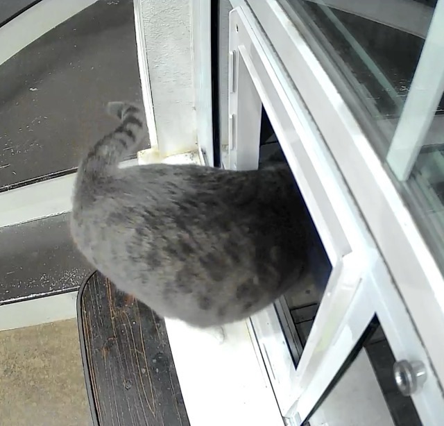 It took over two months, but Thor the gray tabby cat finally figured out the cat flap to the catio.