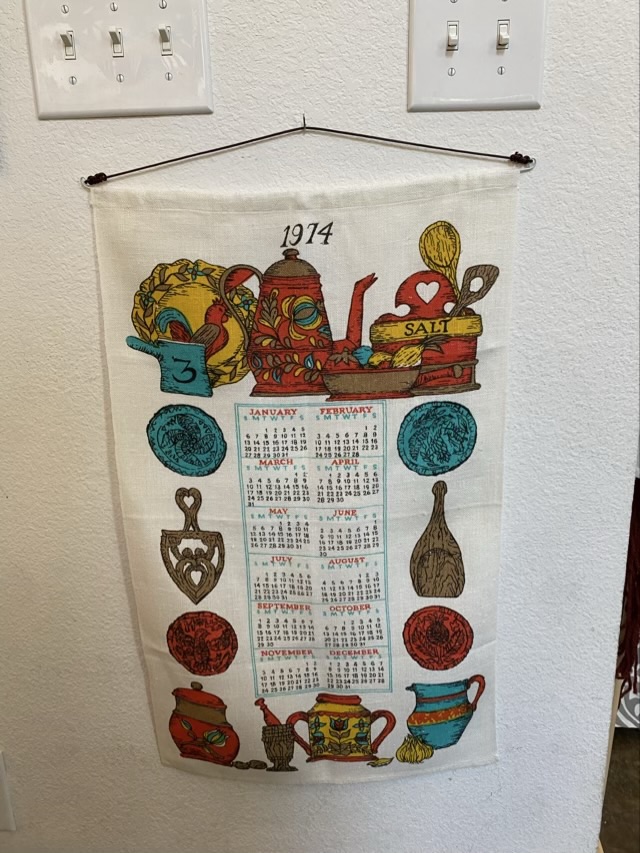 Photo description: calendar towel from 1974 with wire and leather hanging hardware