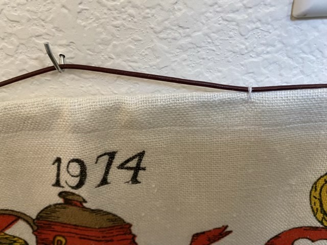 My sister brought me some linen towels from the 70s. I liked the prints on them, so decided to use them as decoration. They all had a narrow sleeve at the top, so I cut down wire hangers to make hanging rods.