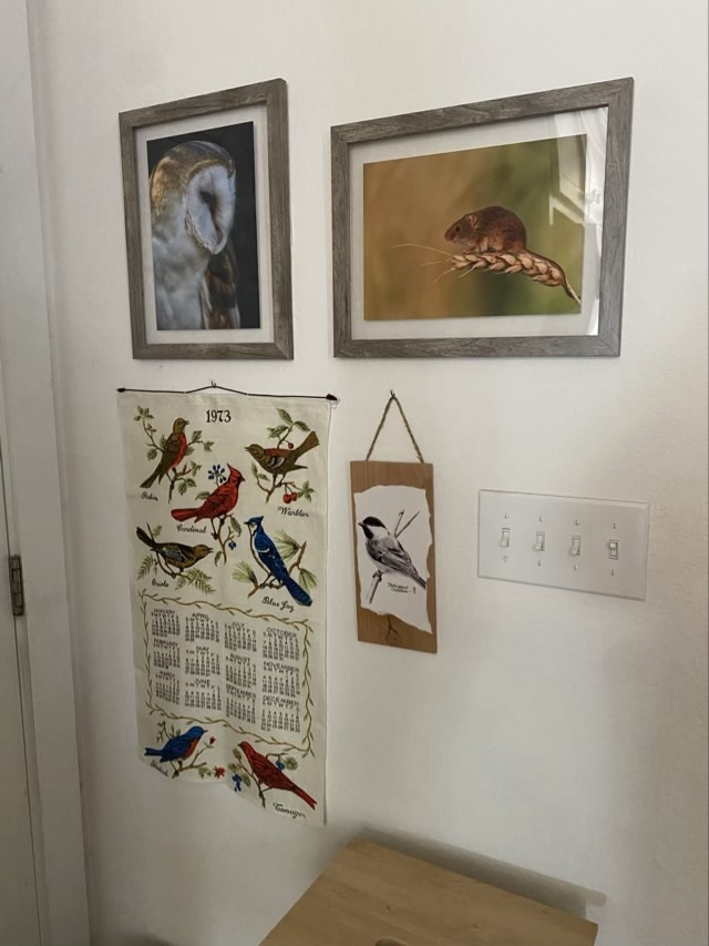 Photo description: closeup of tacked sectionPhoto description: same towel hanging on the wall, but with thread tacks and no sagging, towel has drawings of kitchen implements Photo description: linen calendar towel from 1973 with birds hanging on the wall with new hardware along with chickadee art, and photos of a barn owl and field mouse by Oliver Hellowell