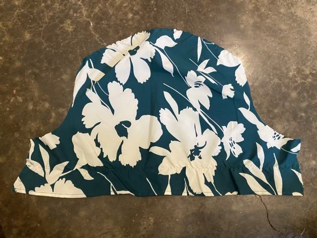 I cut off the sleeves and neckline just below the arm pit, removed one line of elastic, and sewed a hem at the top. The shirred bodice is now a stretchy waistline for a skirt.