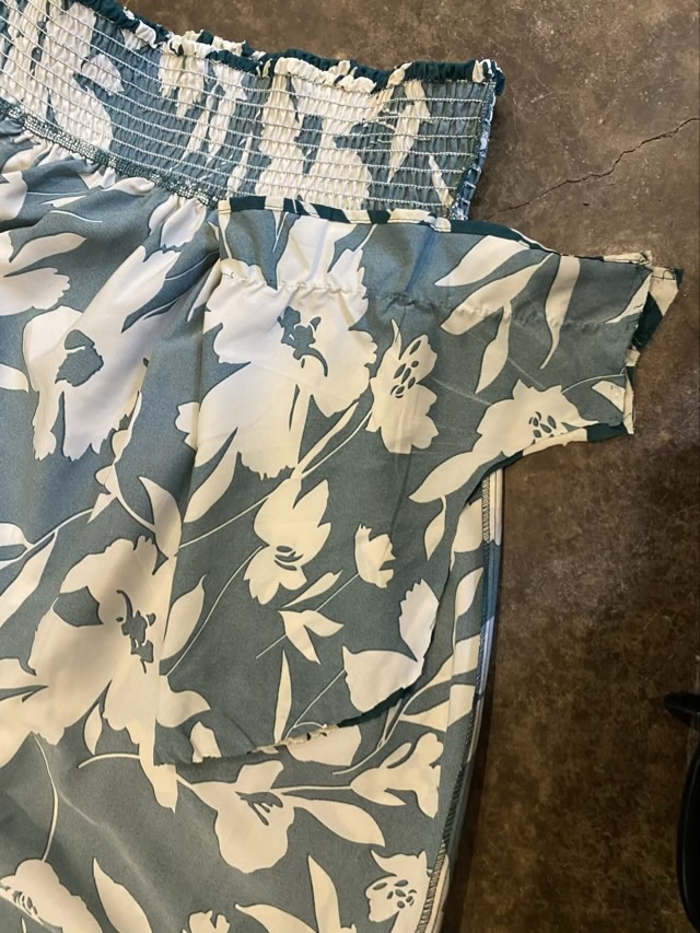 Photo description: green and white floral dress with shirred bodice and elasticized cap sleeves