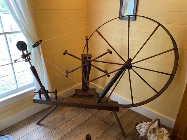 Photo description: 1800s Great Wheel at Man House in Mansfield, TX, yarn weasel in back corner, basket of raw cotton (bottom right)