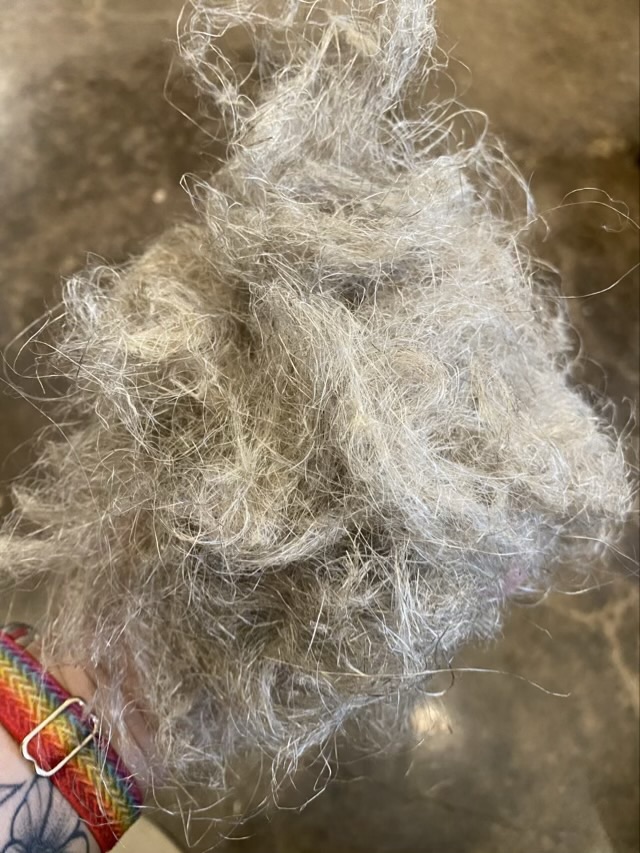 Photo description: double handful of tangled flax fibers