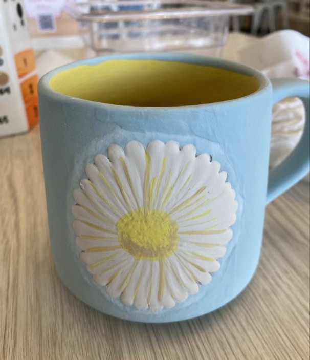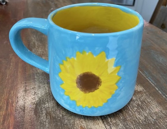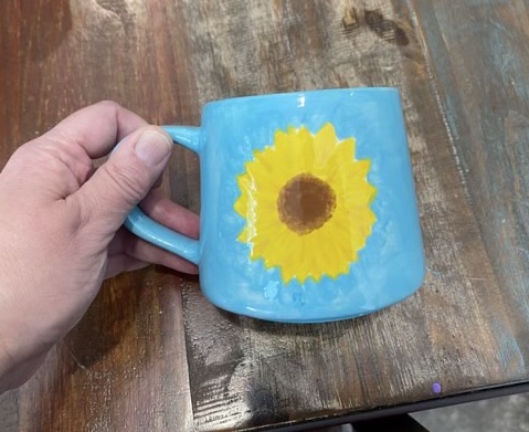 Photo description: ceramic mug painted with a white daisy on a blue background, before firingPhoto description: other side of the same ceramic mug painted with a yellow sunflower on a blue background, before firingPhoto description: sunflower side after firing, same camera angle