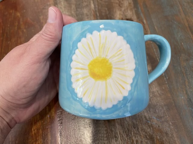 Photo description: same mug, but photographed from the side showing the sloping angles of the sides betterPhoto description: daisy side of the mug, after firing, photographed straight on