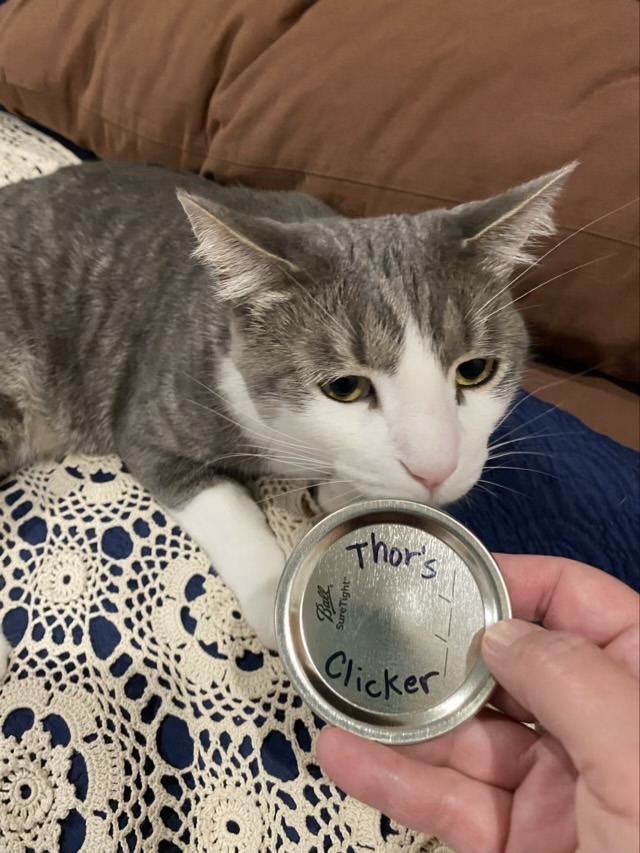 Photo description: Gray tabby sniffing a Ball canning jar lid insert with “Thor’s Clicker” written in Sharpie