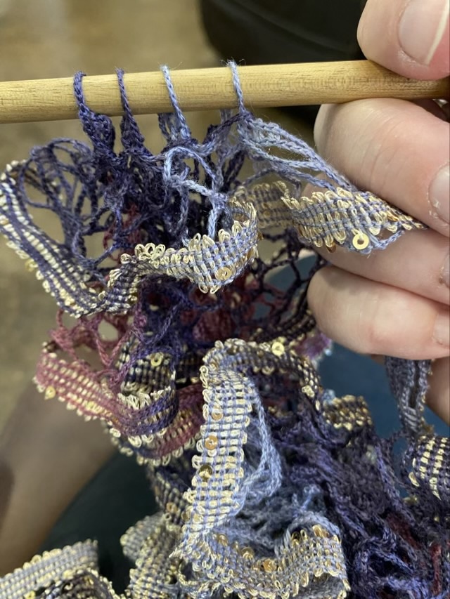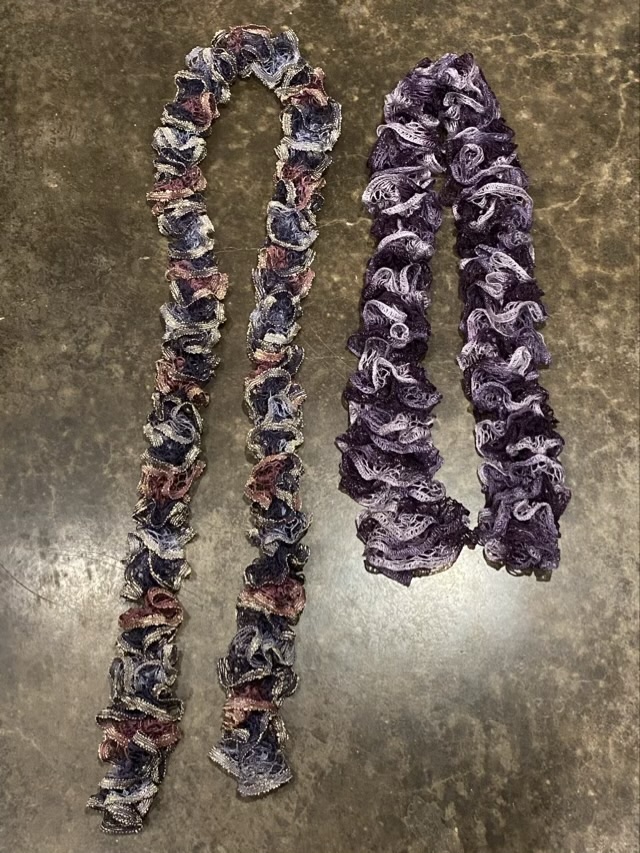 One more comment on ruffle scarves knitted from machine lace “yarn”. Here are two scarves, one using six stitches (purple) and one using 4 stitches (faded glory).