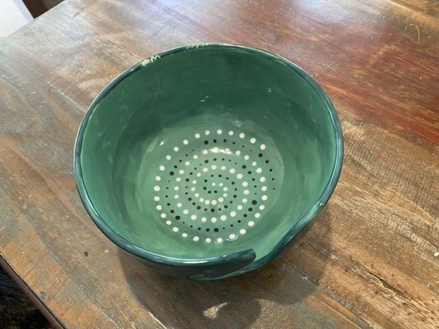 Photo description: green ceramic yarn bowl with holes for yarn or a hook carved in the side for yarnPhoto description: inside of the yarn bowl painted with a spiral of white and black dots