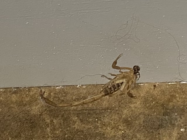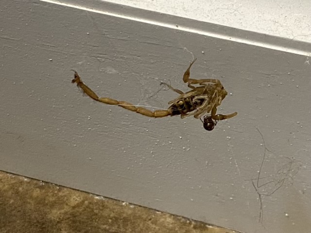 My youngest told me there was a large bug in the bathroom, so I went to look. It was indeed a large bug, a bark scorpion, but it had been taken care of by our friendly neighborhood house spider. I have no idea how the scorpion became entangled in the web an inch off the floor, but the spider definitely had the advantage.