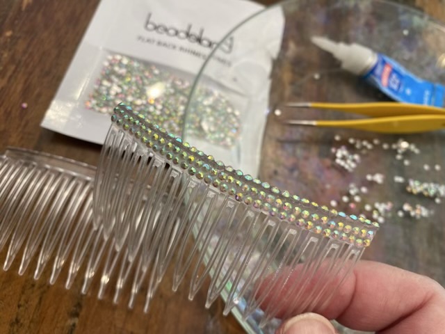 I used a little too much superglue for regular applications of rhinestones, but it turned out OK for the combs because it filled in the spaces between the jewels so hairs don’t get caught in the sparkle.
