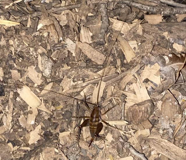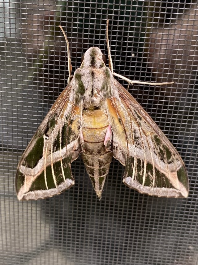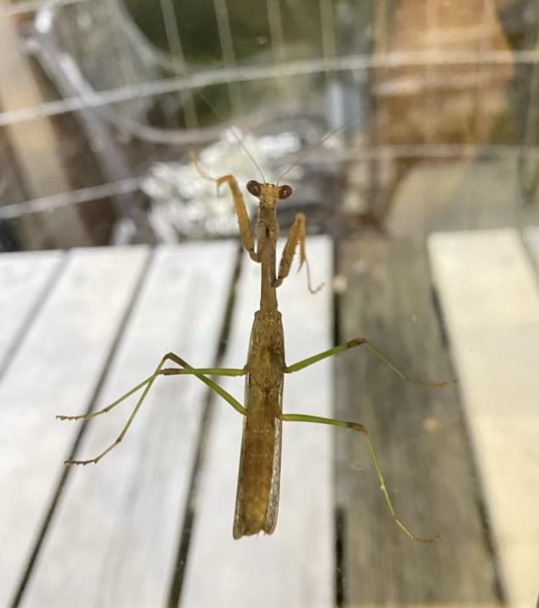 Photo description: Vine Sphinx Moth looking a little ragged hanging out on a window screenPhoto description: camel cricket living its best life in the chicken coop at night, the length of its antenna is impressive at 5-6 times its body length, photo taken with flashPhoto description: Carolina Mantis clinging to a glass window, as seen from inside