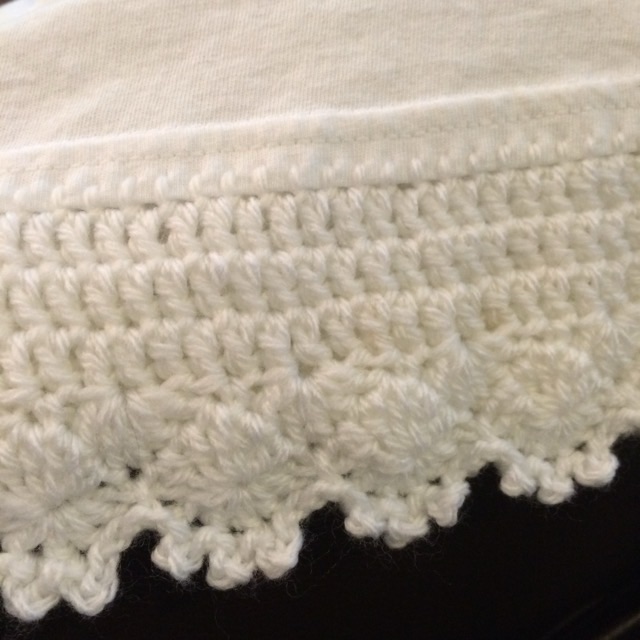 In August 2015 we bought white t-shirts for my kids to decorate with fabric markers and paint. The shirts were a little short, so I crocheted along the bottom hem to give them some length.