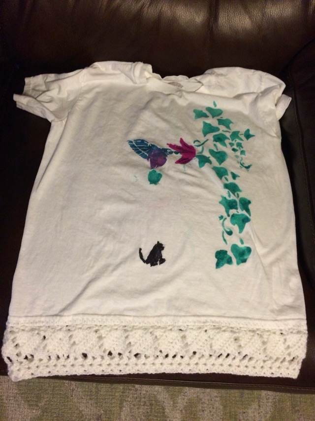Photo description: white t-shirt with the handwritten words “It doesn’t matter what species you are to be friends”, with drawn hand and paws and wings and legs, with a crocheted bottom hem about three inches wide using double crochet, shell stitches, and picotsPhoto description: close-up of crocheted edge showing a blanket stitch base on the original t-shirt hem, three rows of double crochet, two rows of shells, and finished with slip stitches and picotsPhoto description: different white t-shirt with ivy and hummingbird stencils, and a small black cat, with a different style crocheted hem