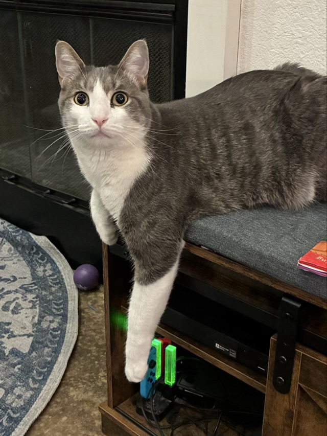 He’s a pretty boy, scared of everything, except mice and bugs, which he brings in from the catio, sometimes still alive.