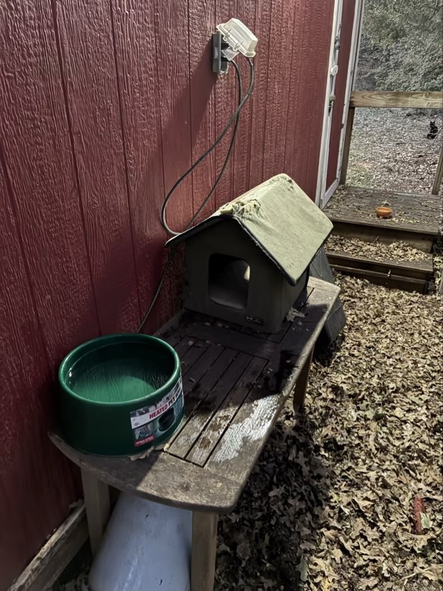 I picked up a heated cat house from a friend that no longer needed it and put it up behind the coop. We have cats that come and go from the colony next door, and as winter heads in a warm spot might be appreciated.