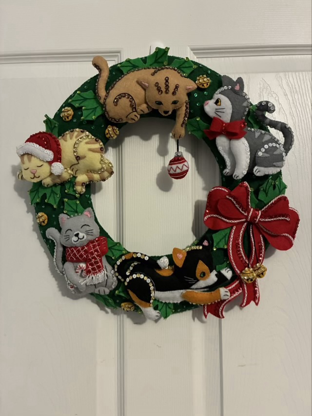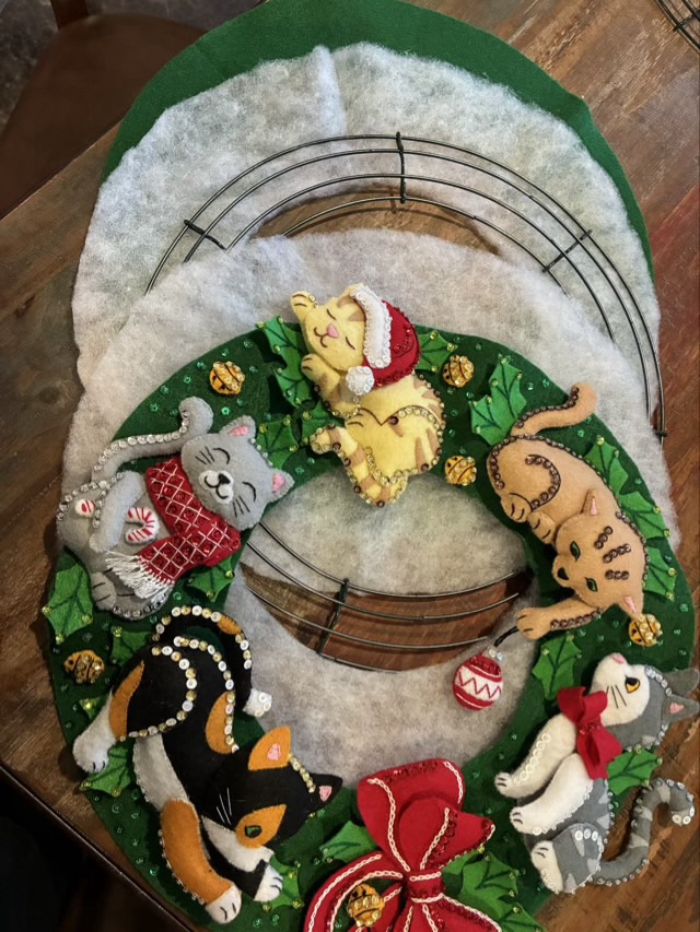 I’ve finished my Bucilla felt wreath kit with a final deviation from instructions. I was supposed to cut out a donut shape of cardboard to go between layers of quilting batting. Instead, I bought a wire wreath support. The cardboard would have worked fine, but the wire makes me feel better. The wreath is 16” in diameter, but a 14” wire support fit better.