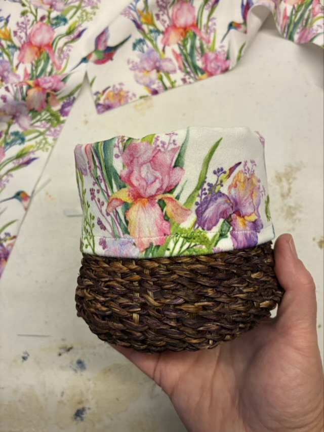 I found some iris printed fabric and lined the basket. It took me two tries to sew a liner that fit the shape of the basket, and I ended up with a single layer that wrapped over the top lip of the basket.