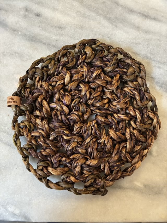 I recently found a tutorial from Sally Pointer on looping around a core and really wanted to try it. I look some dried and rehydrated iris leaves from my garden, twined them, then started looping. I didn’t have enough material for a basket, but the thick twine did make a nice trivet.