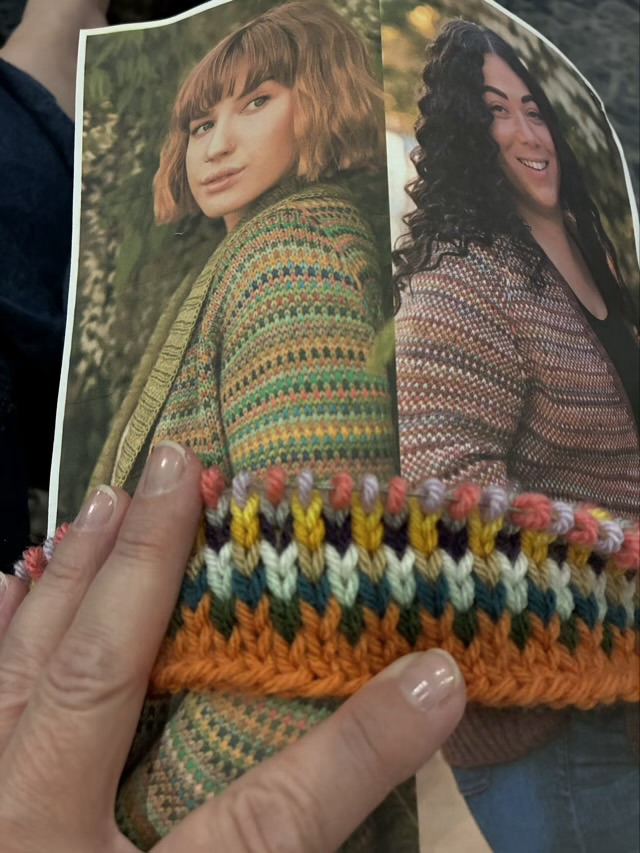 Photo description: start of test piece of 1×1 color work laid against photos of cardigans from Wool & Pine