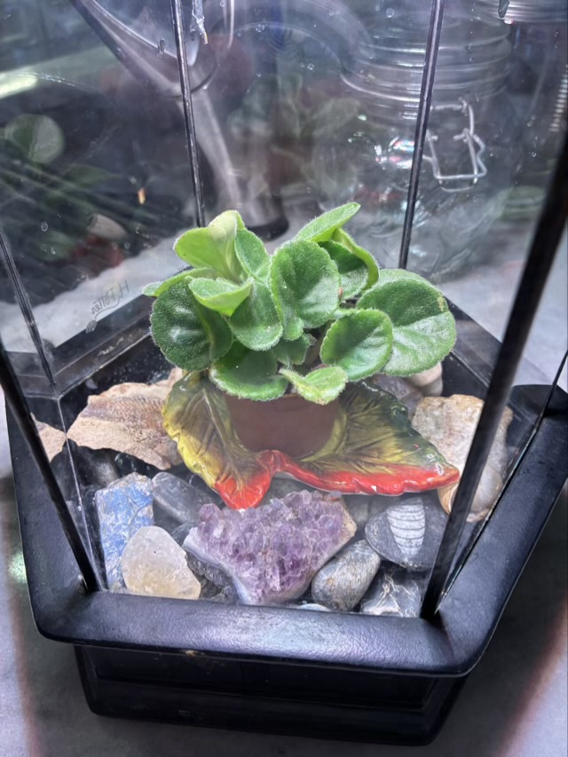 The mossarium I made in a case was not doing well. I tried adding a plant light and it was too much for some of the moss. After six months of steady decline, I decided to clean out the container and put in something else. I have a young African violet that I received from a friend that currently fits.