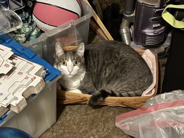 I deliberately put a basket in the closet as a cat bed. I found Thor the cat in the basket and he looked like I caught his paw in the cookie jar. Silly kitty.