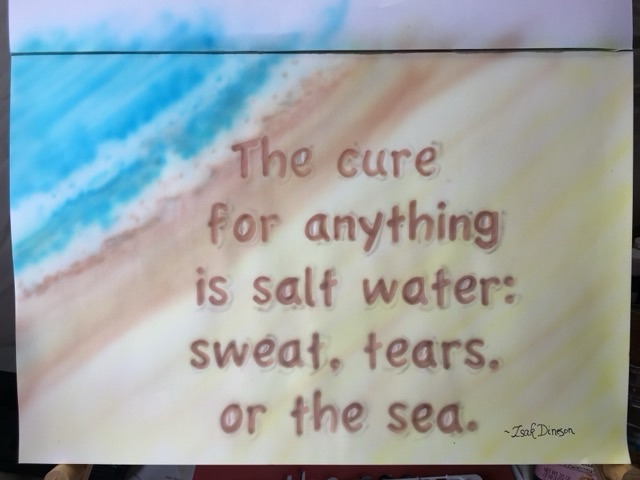 Photo description: airbrushed painting on paper of a sandy beach with waves and the quote “The cure for anything is salt water: sweat, tears, or the sea.” -Isak Dineson