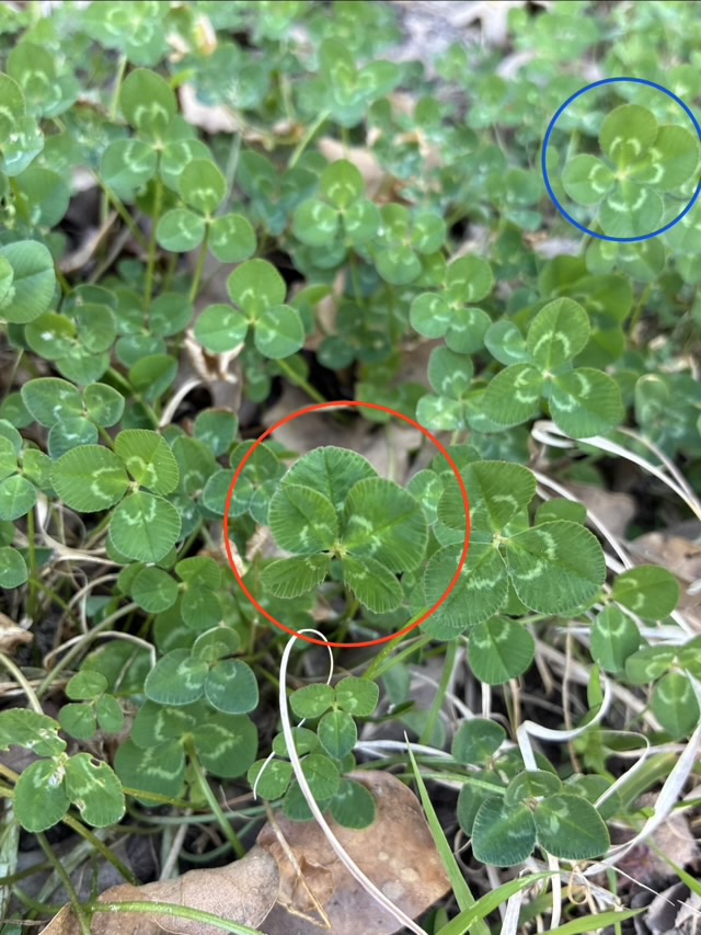 Photo description: same picture as above with the five-leaf clover circled in red, and four-leaf clovers circled in blue, purple, and yellow