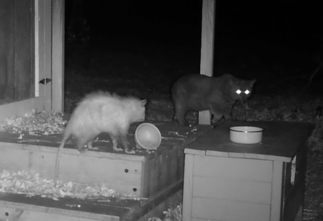 It has been while since I checked trail cams. Mostly the SD cards were full of cats, raccoons, and opossums, but there was a series of photos where an opossum was investigating the cat food when a cat came along.