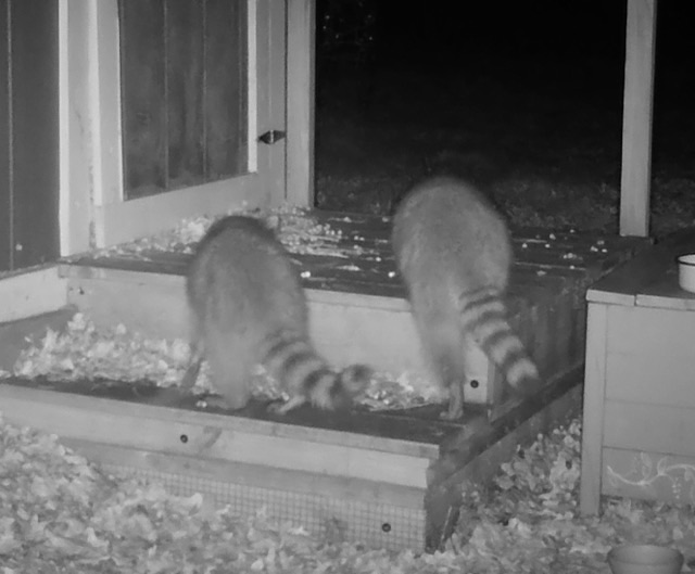 We have a couple of raccoon buddies hanging out in the woods. Rather than the opossums, who arrive individually and leave separately, the raccoons show up and head out together.